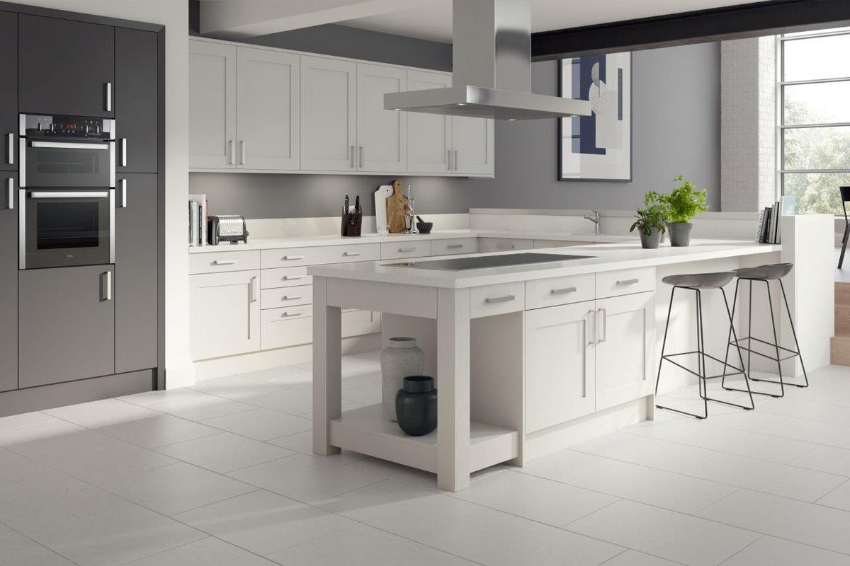 The Ashbury range here is painted in a contemporary light grey. We find the shaker style cabinets in this colour very attractive and a popular choice.