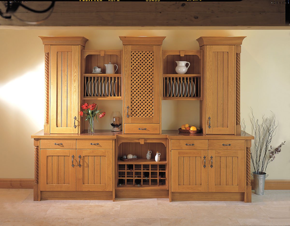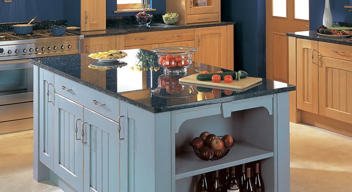 This traditionally styled stop chamfered oak design features a subtley distressed frame and a tongue & groove styled solid centre panel. The random imperfect joints are clearly visible in this light oak kitchen that has been finished in a clear matt lacquer, showing off the carefully selected oak. This kitchen features a ‘traditional blue’ island. There are a choice of eighteen standard beautiful colours. The standard way of finishing this model is to rub down the edges of the frame exposing the natural wood underneath, then seal in a clear matt lacquer. Because this process is carried out by hand the doors are also available fully finished on the edges.