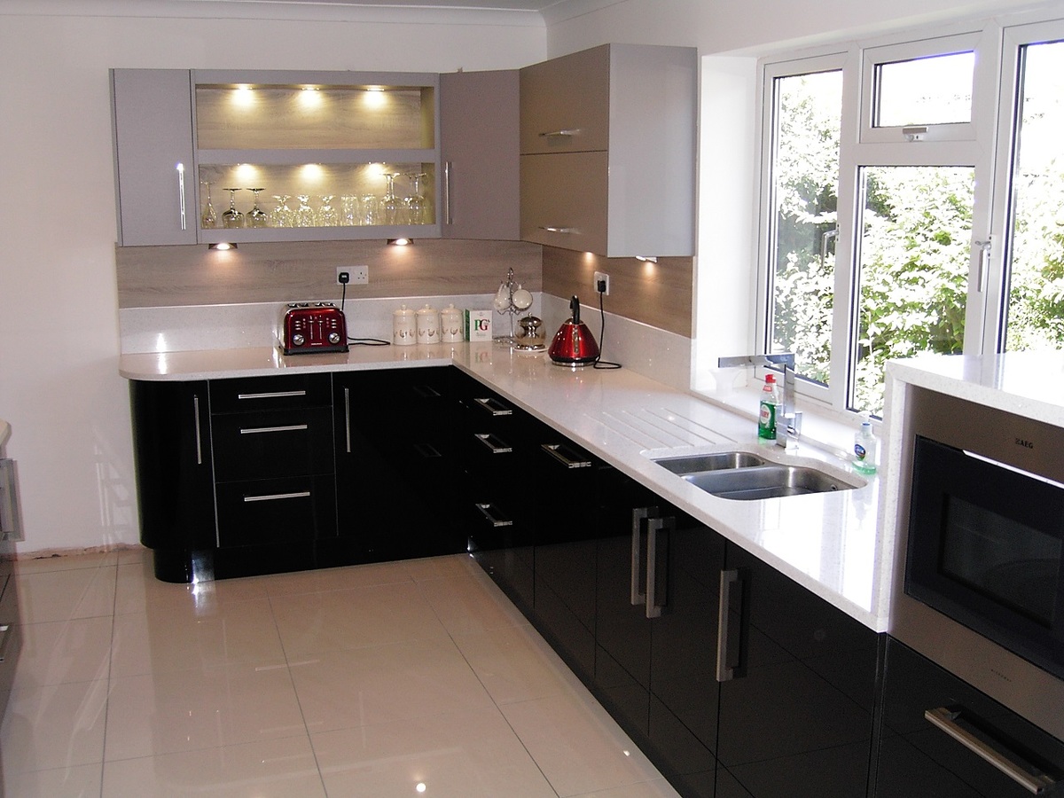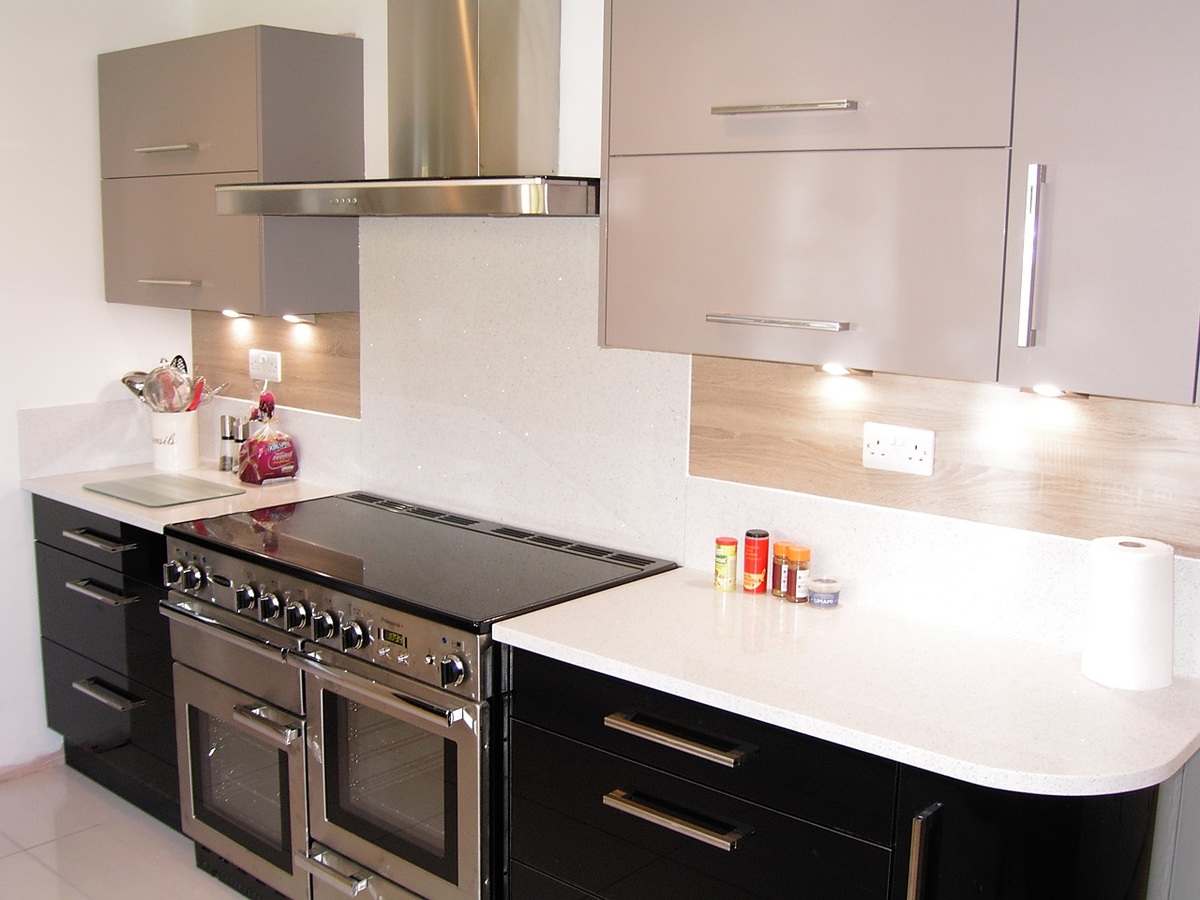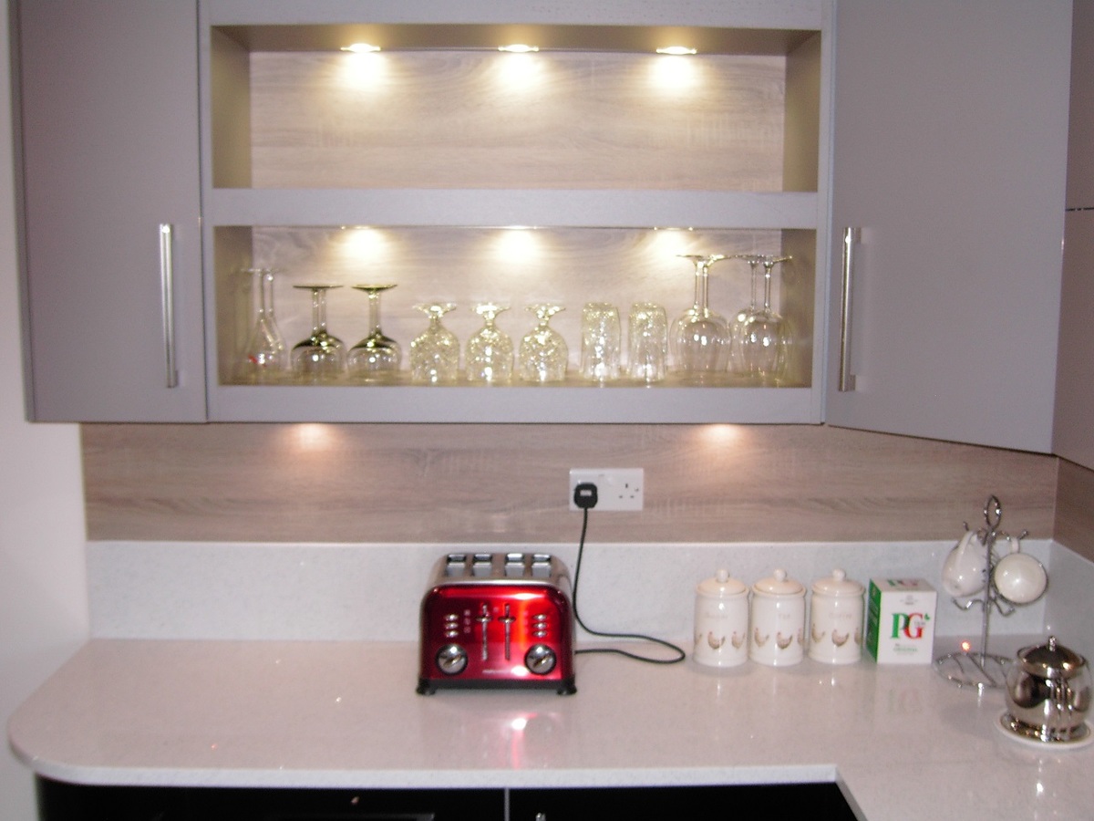 Combining both stunning Black Zurfiz Acrylic and Matt Grey doors gives the kitchen your own unique finish. The White Glitter stone Quartz Worktops and splash back give the kitchen the modern twist. To give the 'WOW' factor Truffle Bardolino Oak splash back has been added to give more convenience and practicality. Adding the curved seating area makes it a key feature, and ensures a more communal area for all the family and friends.