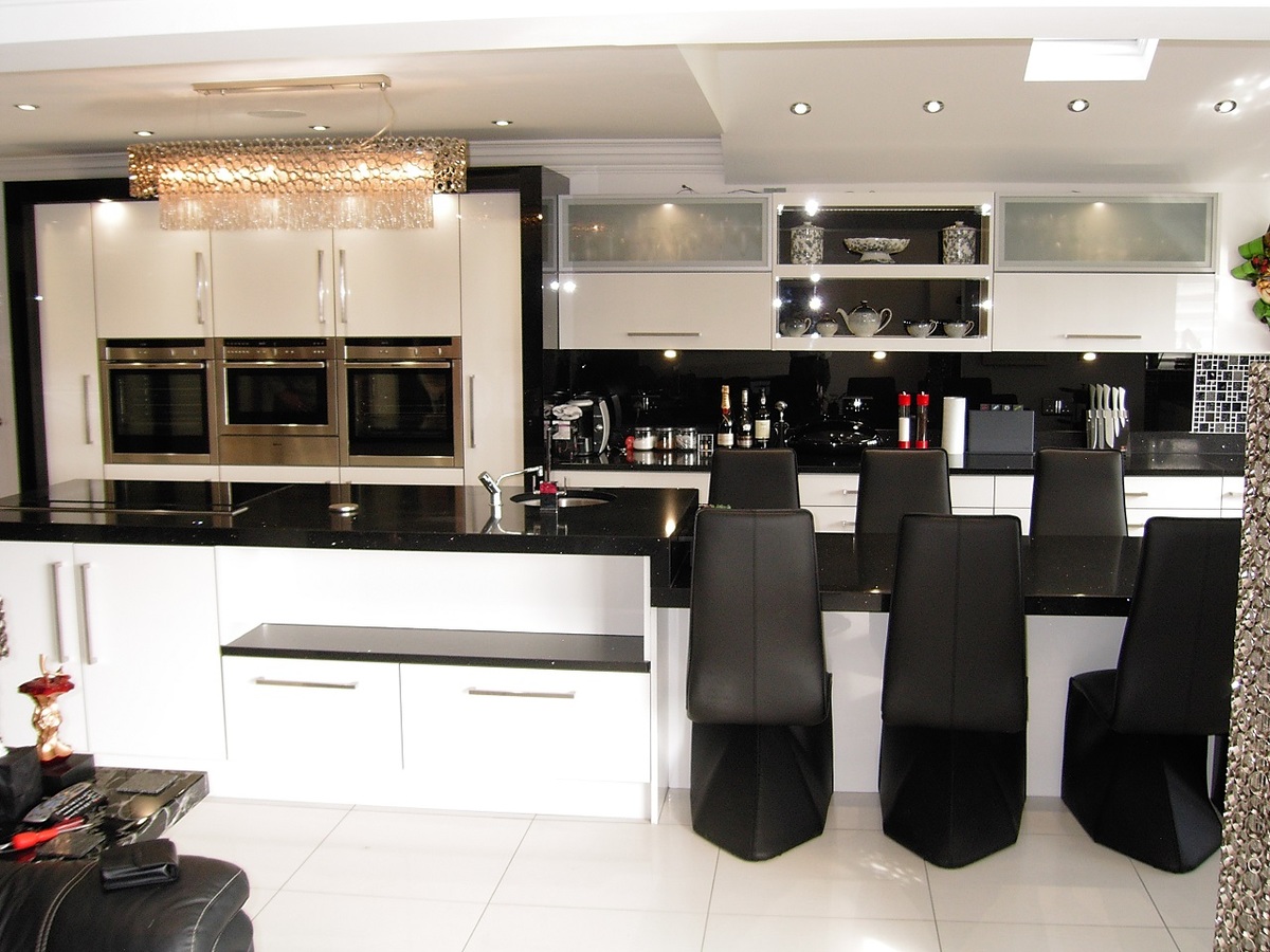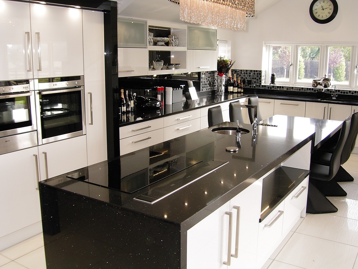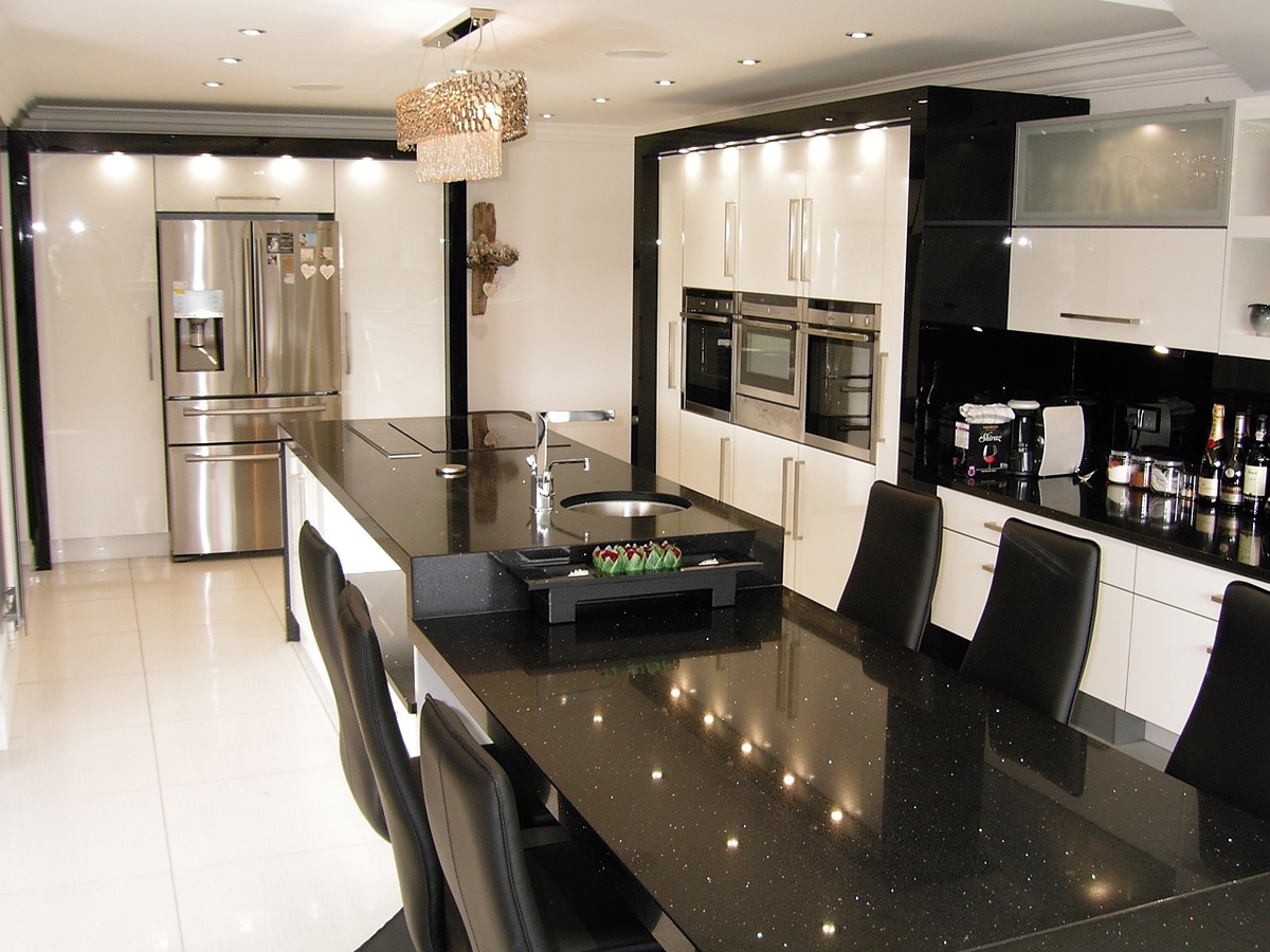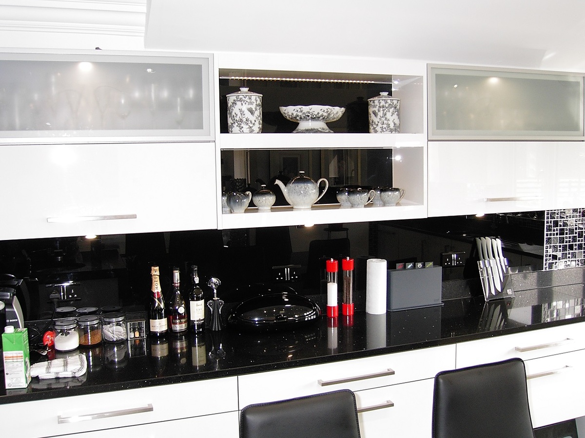 For a more contemporary kitchen these White Acrylic high gloss doors just add the simplicity to any design. These Acrylic fronted doors also come in a wide range of stylish colours to suit any design.By adding the durability of the Black Glitter stone Quartz Worktops, with the compact AEG appliances it gives the practicality and style that you have been looking for.
