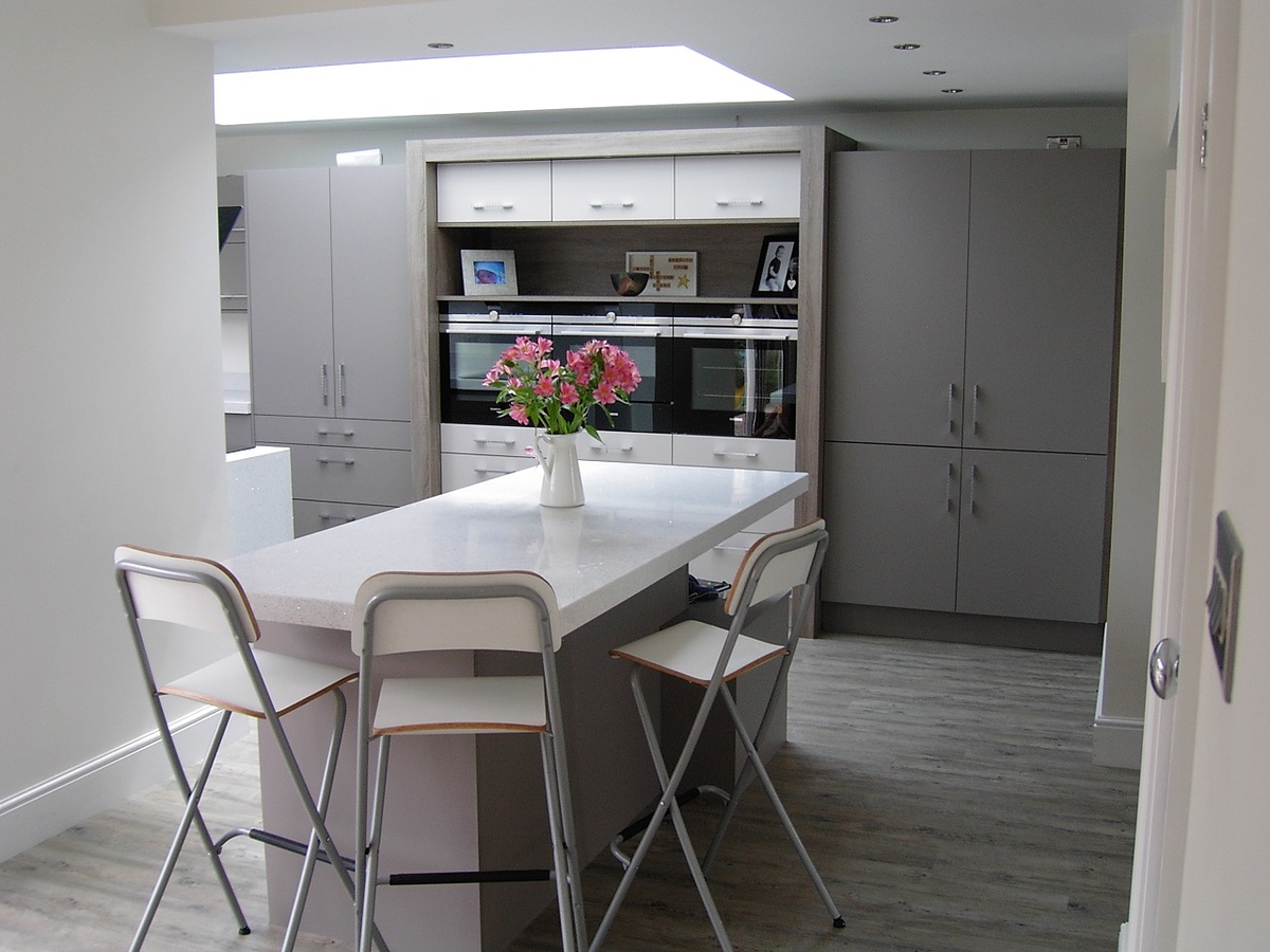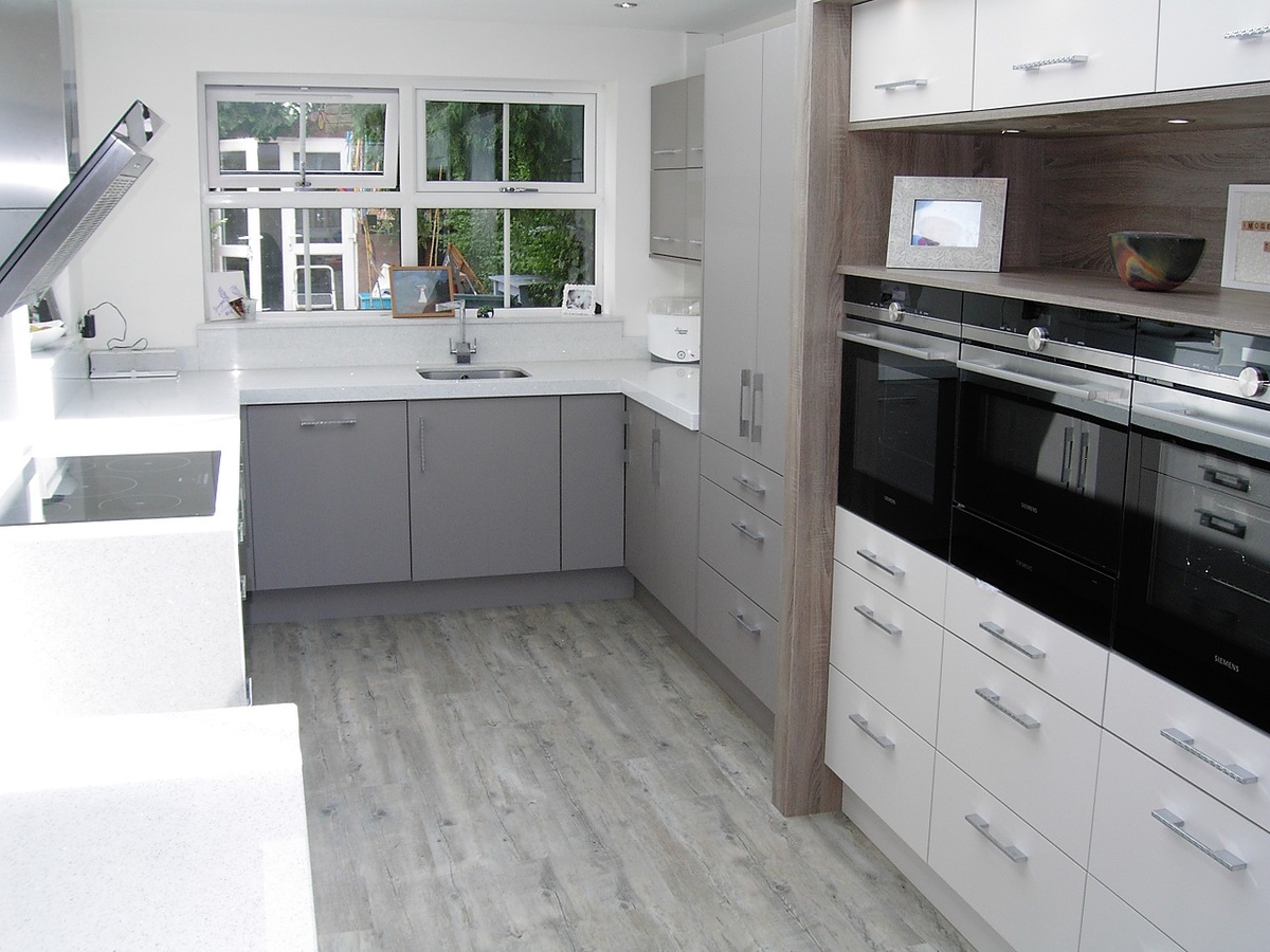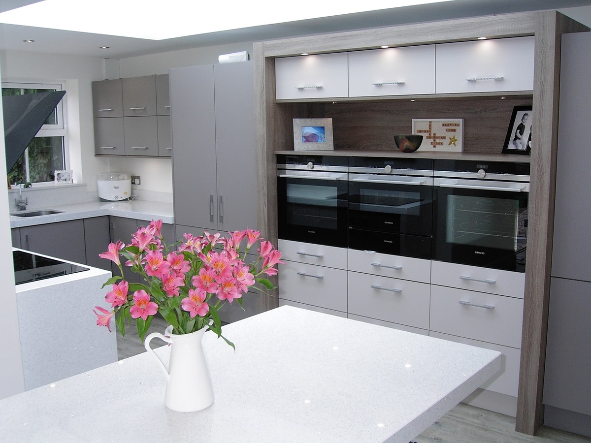 For a more Modern kitchen these White and Grey Acrylic high gloss doors just add the pure and simple design you may have been looking for. The Acrylic fronted doors also come in a wide range of stylish colours to suit any design. By adding the durability of the White Glitter stone Quartz Worktops, with the compact built in AEG appliances it gives the kitchen the instant practicality and style.