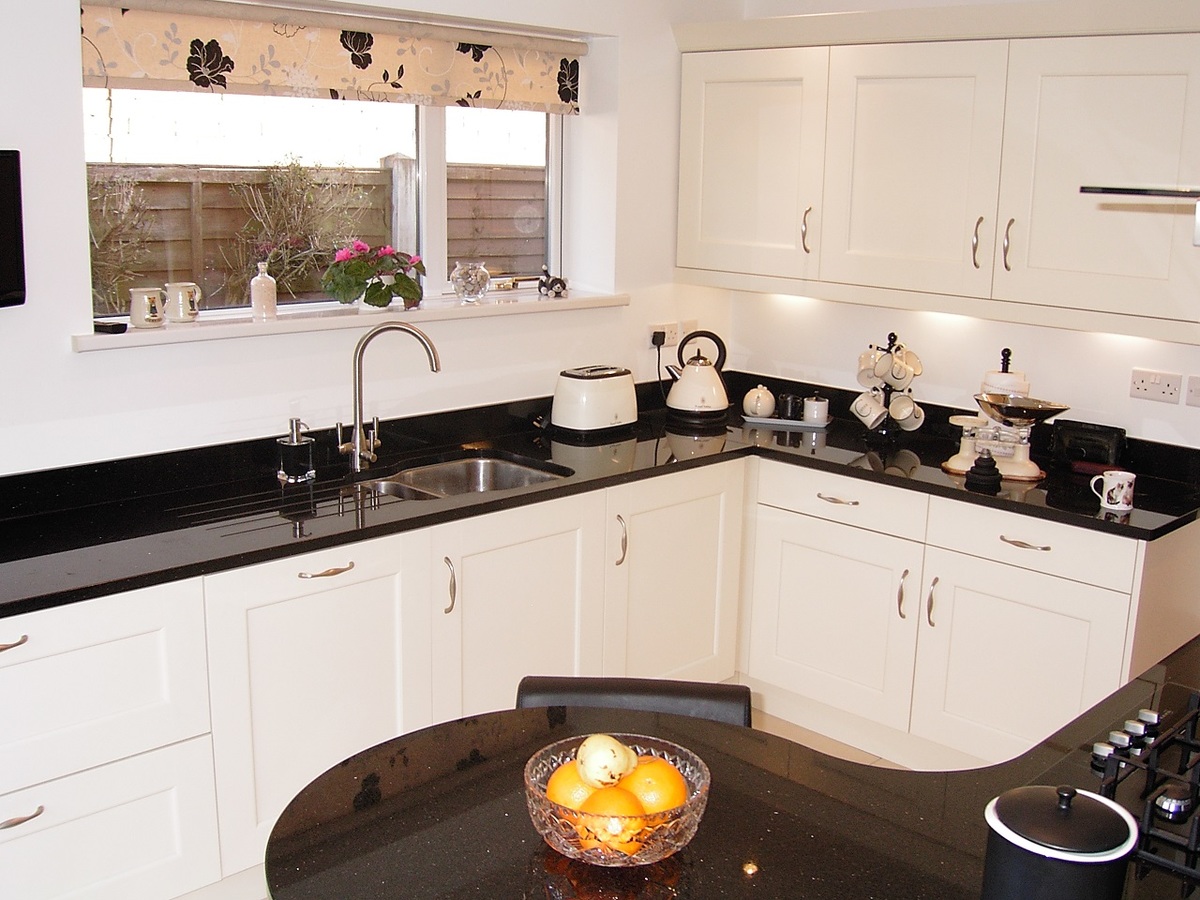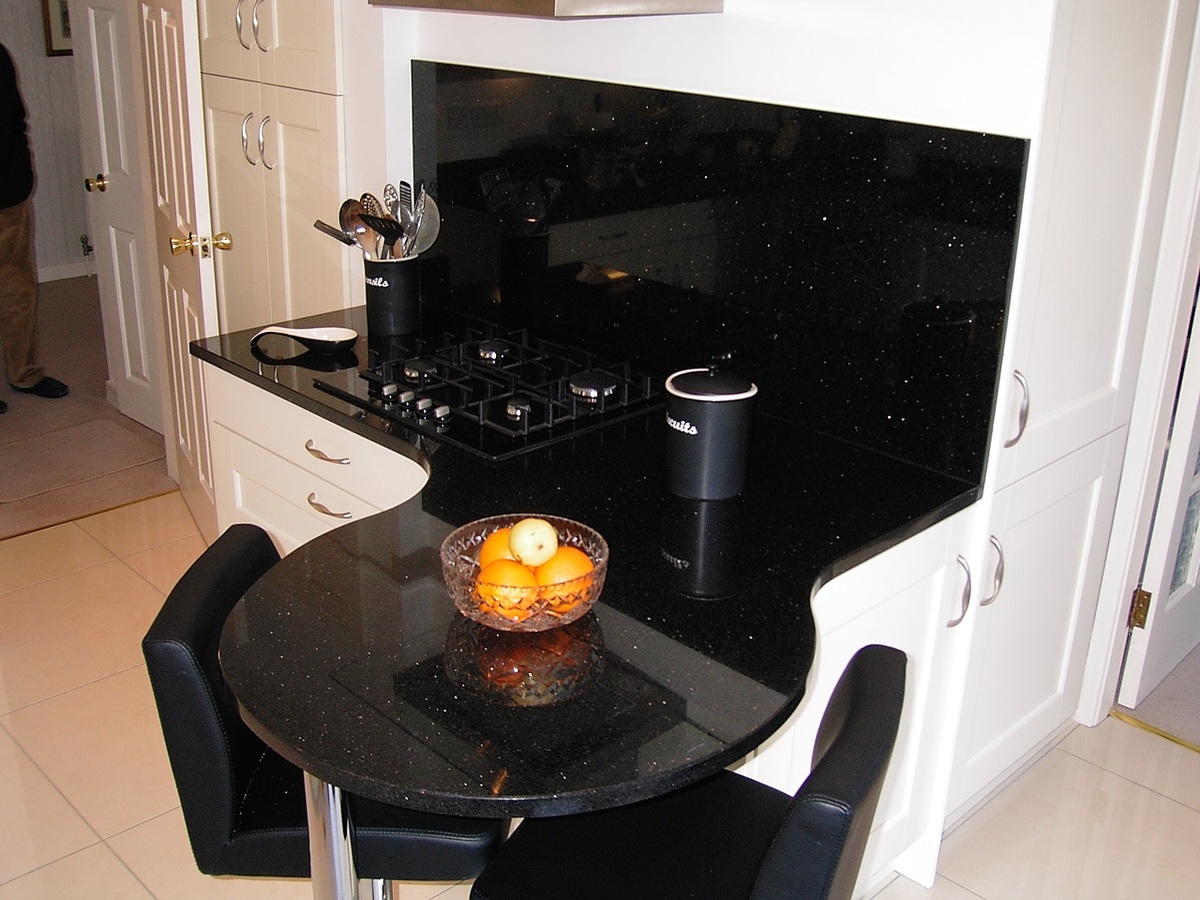 The clean lines of the Black Star Galaxy Granite, gives a stylish design you can use on any kitchen. The Ivory painted Belfell Doors gives the pure and simple feel. By making the worktop Curved it is a feature in itself and ideal for any seating area. This sets the tone of a Contemporary achieved in this overall design.