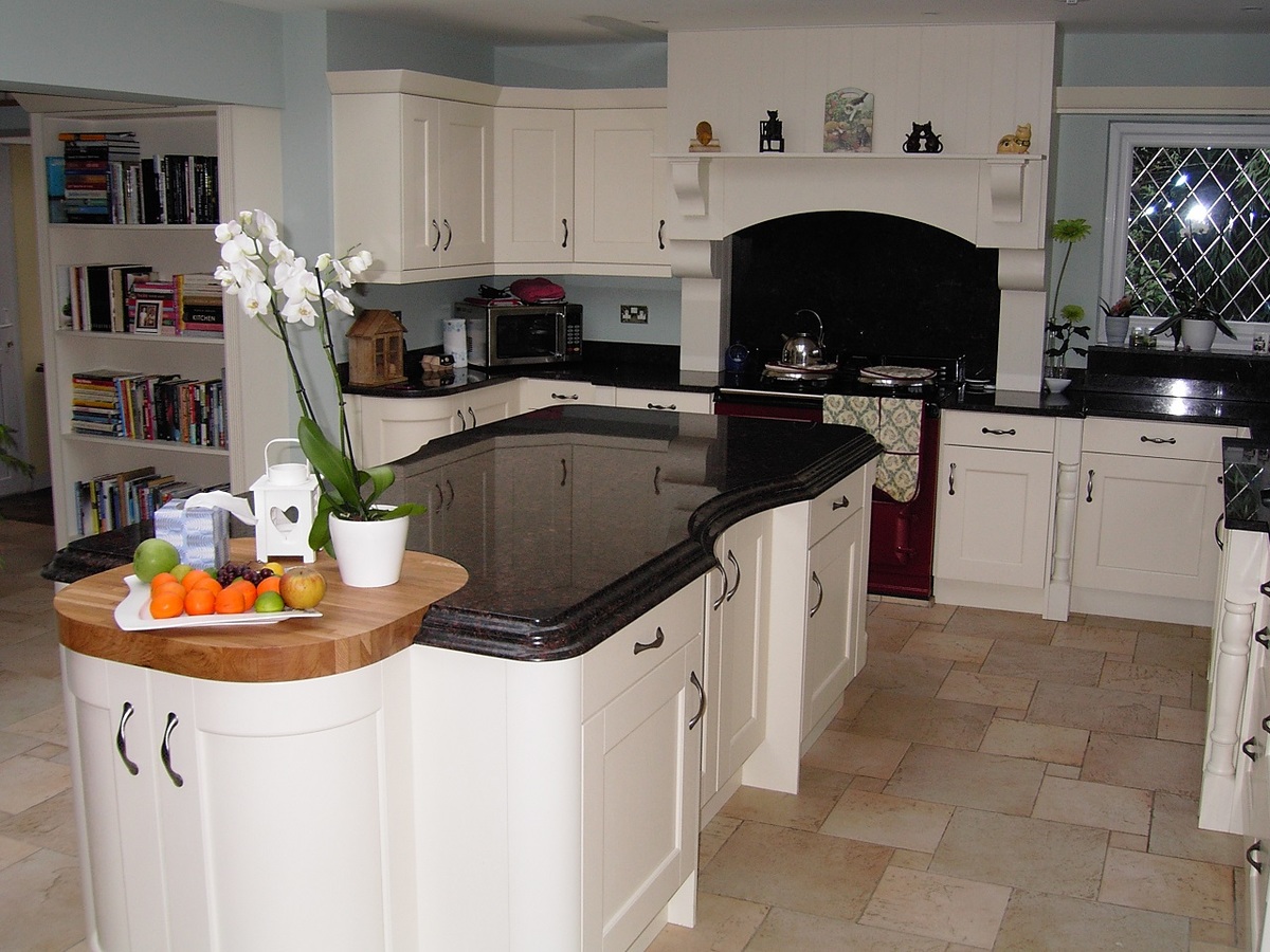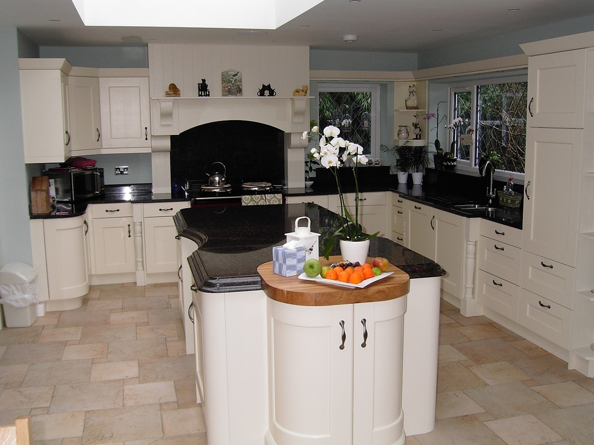 The clean lines and uninterrupted curves of the Tan brown Granite with a double waterfall edge, gives a stylish design you can use on any kitchen. Adding to the island is a Solid Oak Wood feature creating that authentic traditional feeling. The Ivory painted Belfell Doors gives the pure and simple traditional feel, and sets the tone of the Shaker Style Kitchen achieved in this overall design.