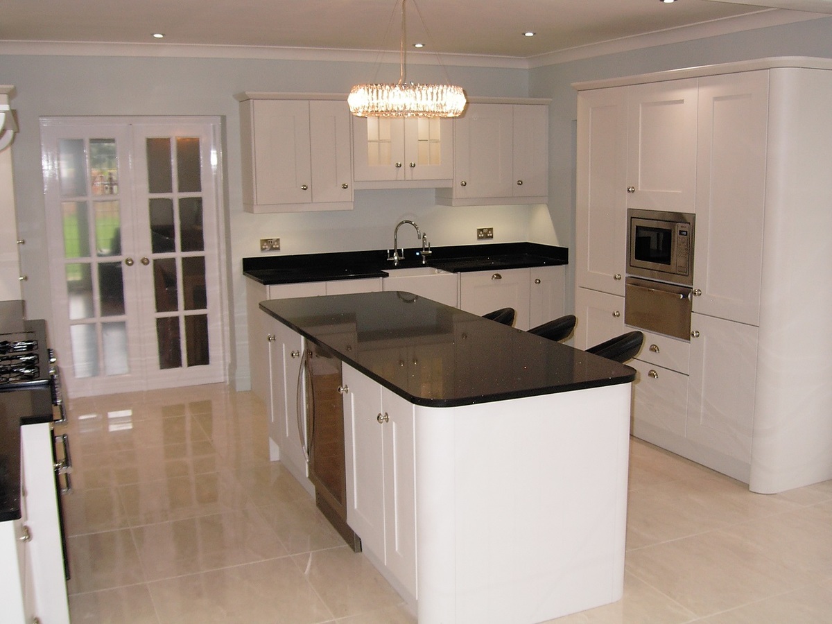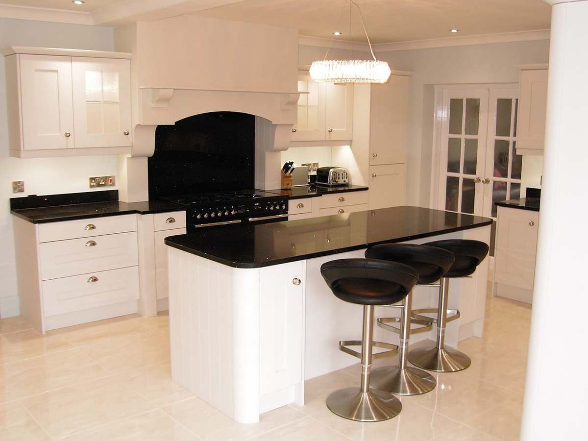 Classic White painted Shaker style door units bring this design bang up to date. This design is the perfect balance of style and practicality when mixed with the Black Glitter stone Quartz worktops, as it is durable and convenient. This kitchen can be accessorised pretty much however you like; and would look great against bold statement colours which are available in both Glitter stone Quartz and Shaker style door units.