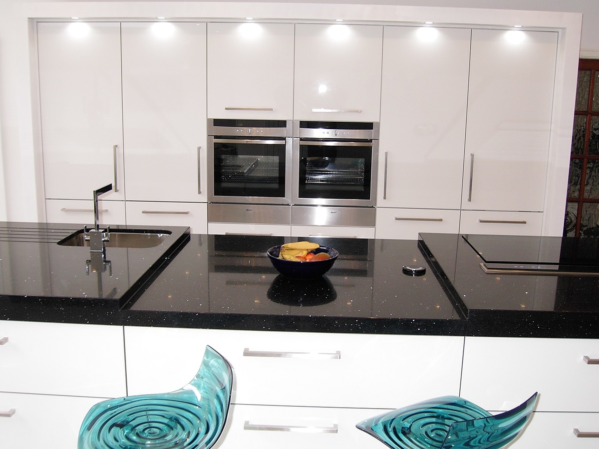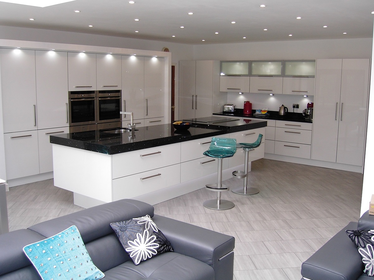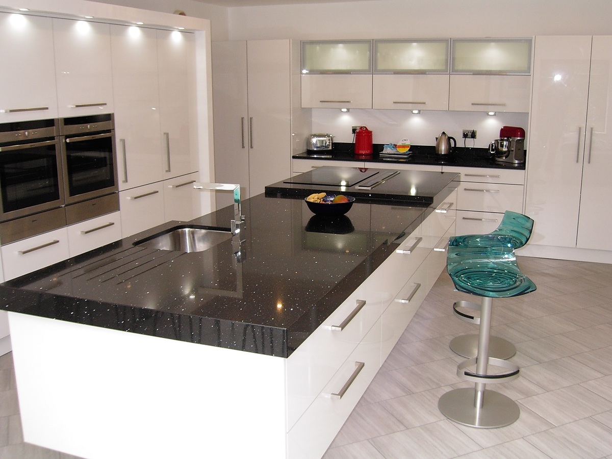 By combining both the Black and White Glitter stone Worktops in this kitchen it gives the sense of your own unique finish. This also complements the raised seating area very well. The White Zurfiz Acrylic doors also come in a wide range of stylish colours, which enables you to be able to change this design to create your very own chic idea. This kitchen really sets the tone of contemporary.