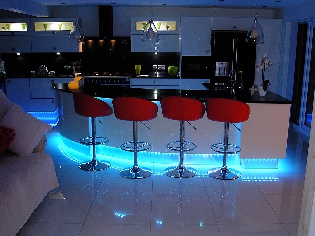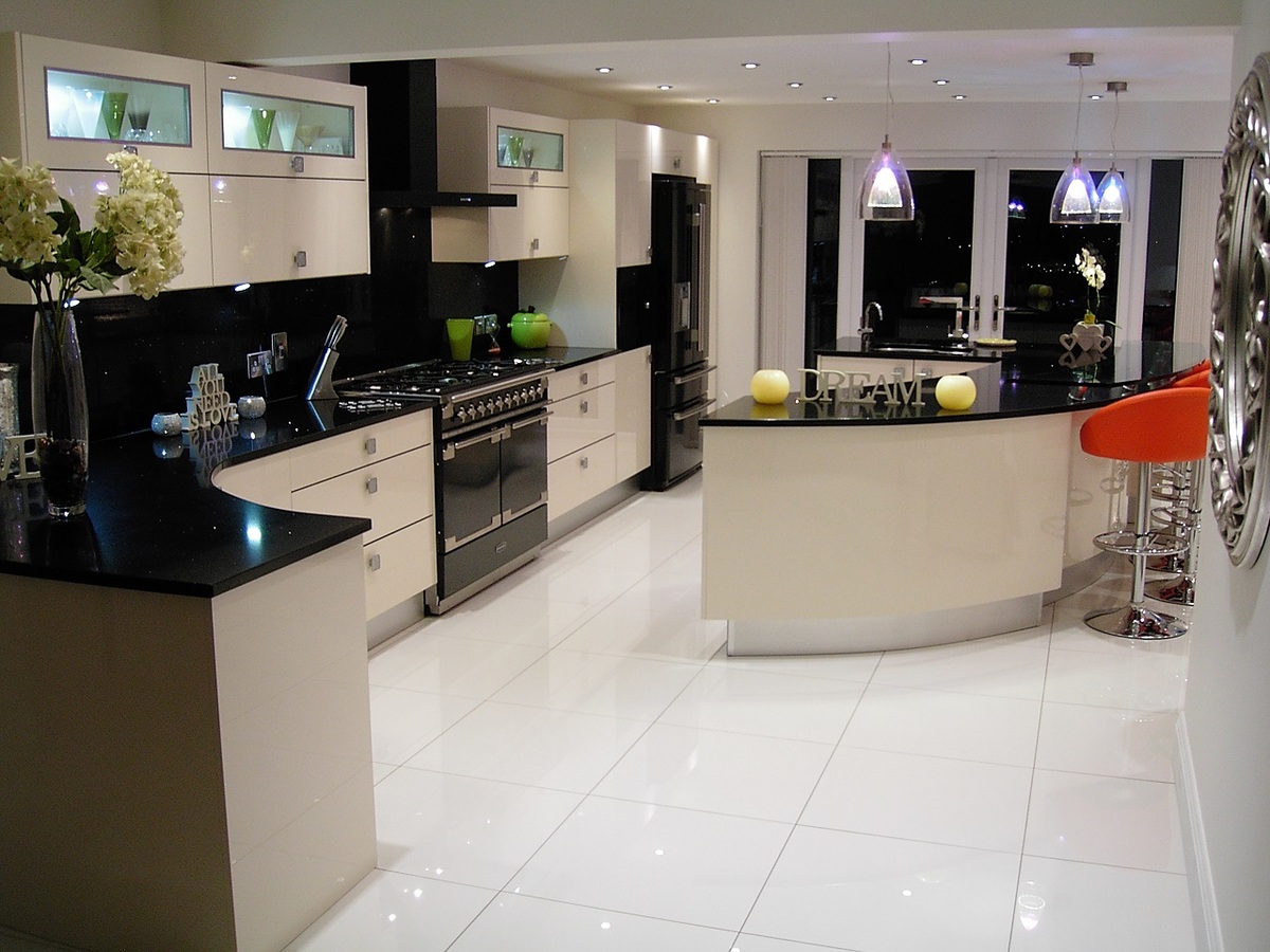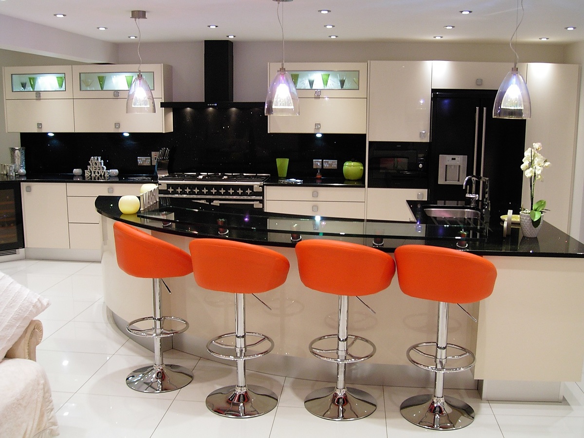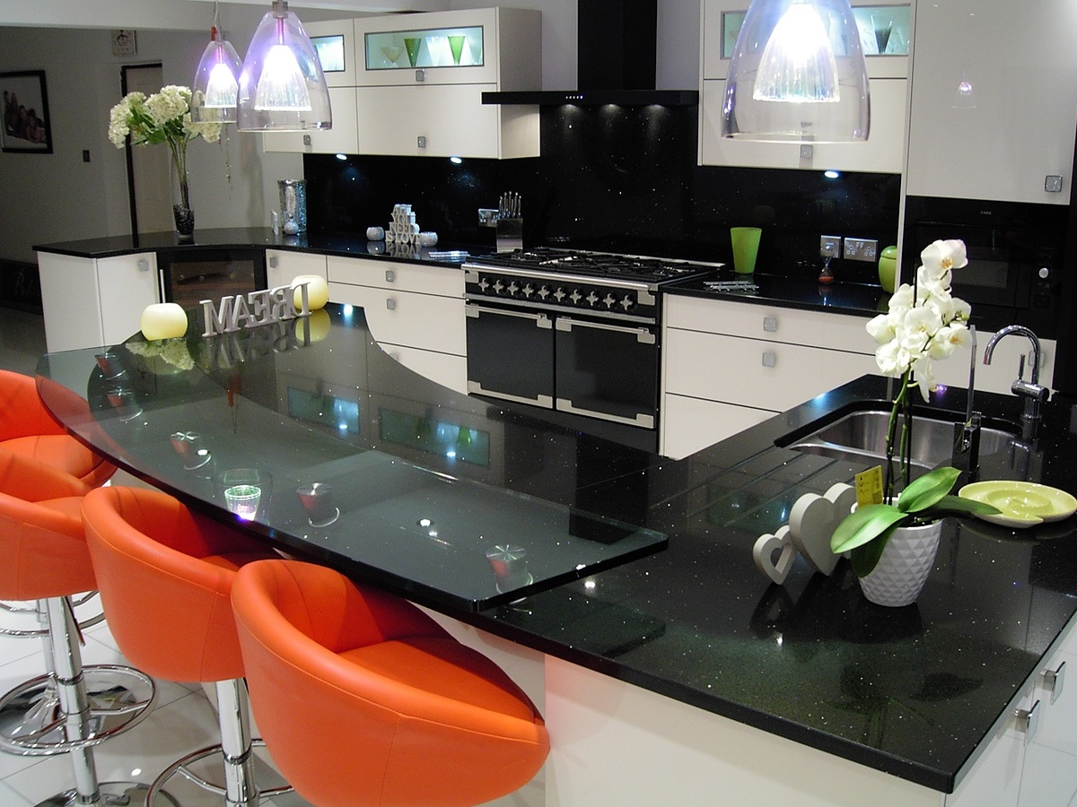 These Stunning Zurfiz Acrylic doors are perfect if you're a fan of the minimalistic look. Easy to clean, these Acrylic fronted doors also come in a wide range of stylish colours to suit any look. The Black Glitter stone Quartz Worktops and splash back give the kitchen the modern twist, and complements the raised glass seating area. To give the 'WOW' factor hidden LED lights have been fitted, which are changeable with a remote control.