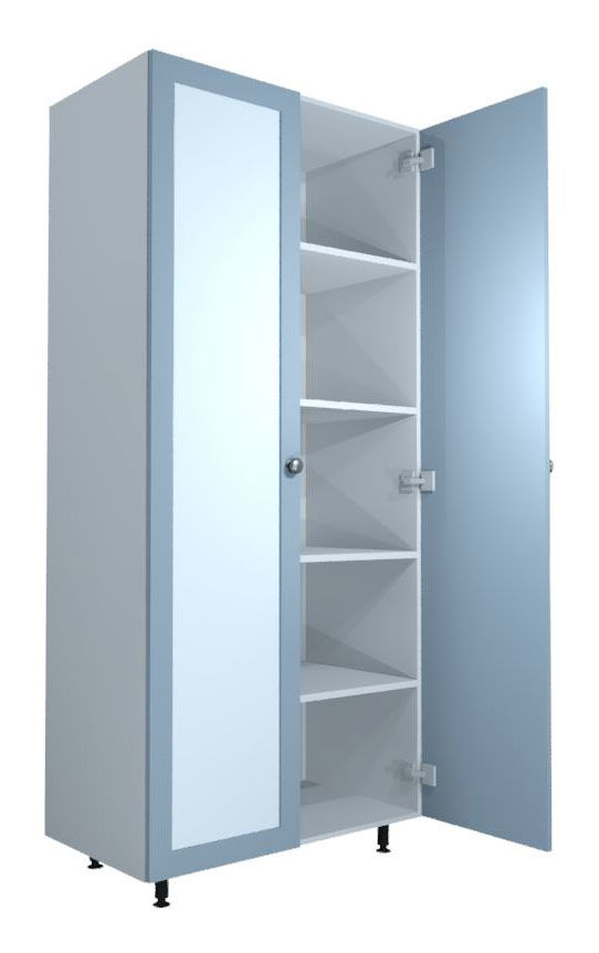 Double width Mirrored wardrobe with fixed shelves at approx. 410mm spacings, soft close hinges and solid back.